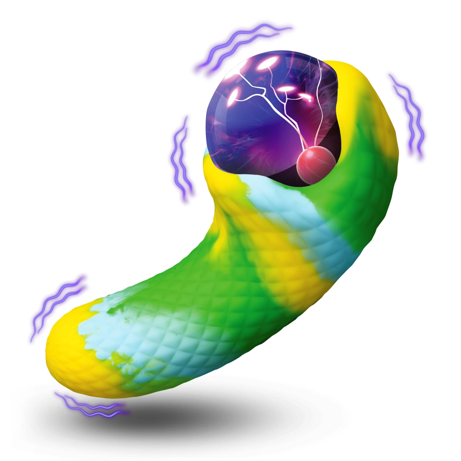 Experience pure ecstasy with the Electric Eye Plasma Vibrator! Shaped like a mythical creature with scaly green-blue-yellow texture, this powerful vibrator features a captivating touch-activated plasma eye that lights up with pink electric sparks. Feel the power surge through dual motors offering 3 speeds and 7 patterns, sending shivers from both ends. Its premium textured silicone promises intense sensations for ultimate satisfaction. Easily recharge via USB and enjoy splashproof fun with its IPX5 rating. Perfect for those who demand power, versatility, and unforgettable nights. Seize your desires and indulge with the Electric Eye Plasma Vibrator today!