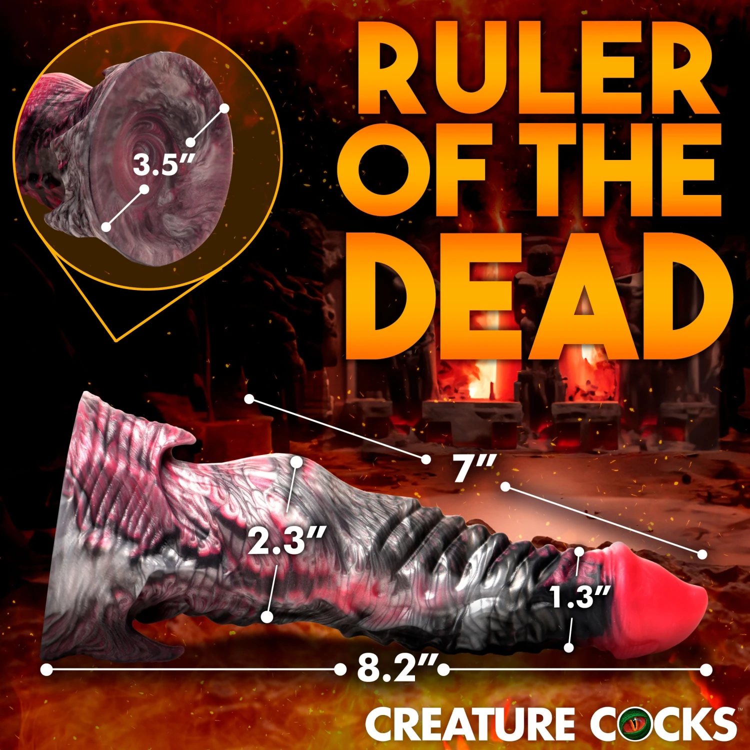 As you travel to the land of the dead, the King has claimed you as His own! Take this large, beastlike dildo and enjoy the feeling of the King’s cock in your ass! This black and red rod has a pierced, tapered tip, ridges along the shaft, and fat veins. Near the base is an even larger bulge that you’ll have to stretch to fit over! The shape is perfect for rubbing against your prostate while the tapered tip helps with insertion! The premium silicone body is smooth with some squish to it that helps it fit in every curve. Completely body-safe, it is phthalate-free and best used with water-based lubricants. The strong suction cup base also doubles as a harness-compatible base for pegging! Use it hands-free or with a partner in kinky cosplay and fantasy roleplay. After play, wash with warm water and mild soap then spray with a toy cleaner and let it air dry.