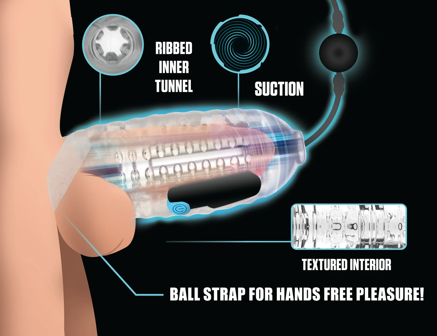 Hands Free Sleeve: This stretchy, TPE sleeve has a ball strap that keeps it securely on your cock for hands-free play!