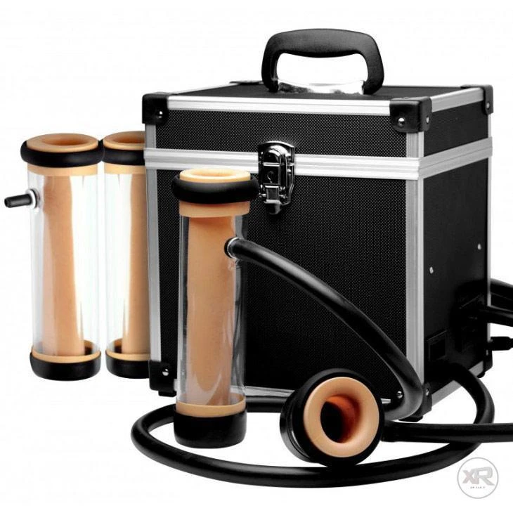 Three different kinds of cylinders are included. The first is specially designed to suck your shaft, at nearly 9 inches long and lined with supple rubber for a tight seal. It feels so good that we’ve included 2 of them in case you wear out the first! We have also included a textured cylinder, lined with tantalizing nubs that will massage your dick as it’s sucked. Finally, the smaller cylinder is for more targeted pleasure, such as your cock head or even the clitoris or nipples.