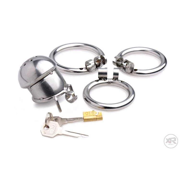 Measurements: O-rings are 1.5, 1.75, and 2 inches in diameter. Cage is 1.75 inches in length, 1.25 inches in diameter.Material: Stainless steel.Note: Includes locking mechanism and two keys.