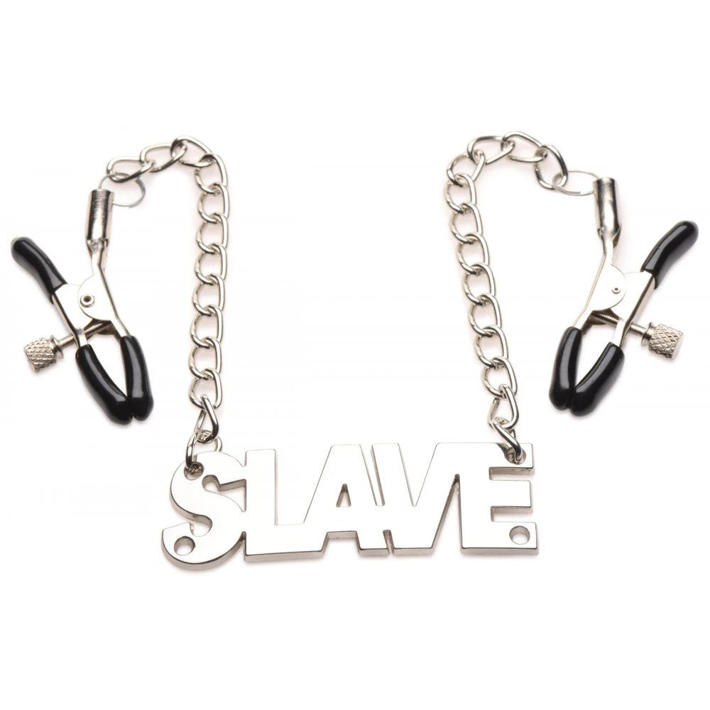 Have fun with this nipple clamp set! Each clamp has a rubber tip to protect delicate skin and a screw to adjust for pressure. The chains and slave sign are made of nickle-free metal. To clean, spray with a toy cleaner and wipe dry.
