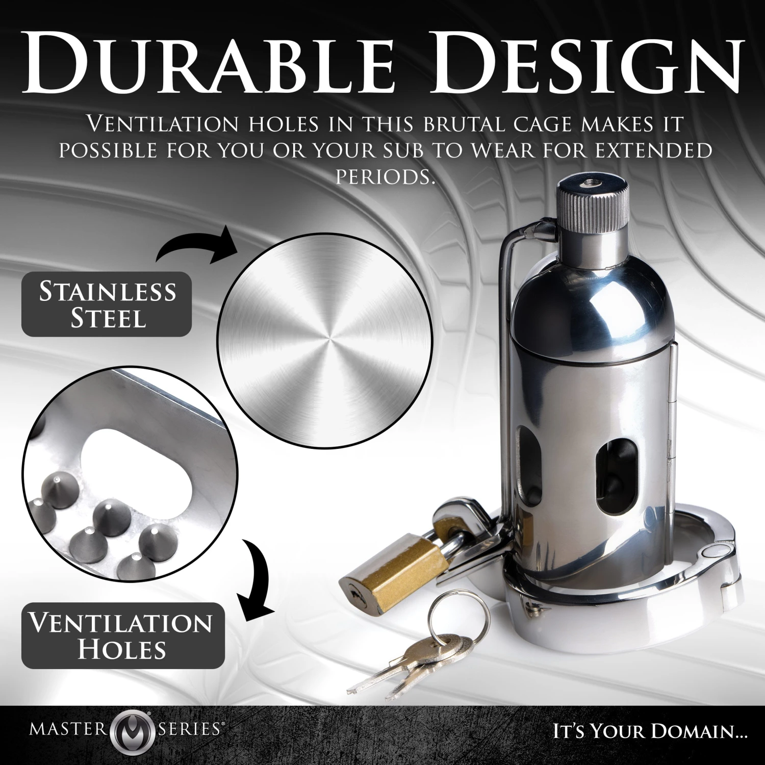 The cage is lined with spikes that are pointy enough to poke and stimulate but not sharp enough to injure the member of you or your sub. Additionally, the ventilation holes allows your subs dirty cock to breathe during long sentences.