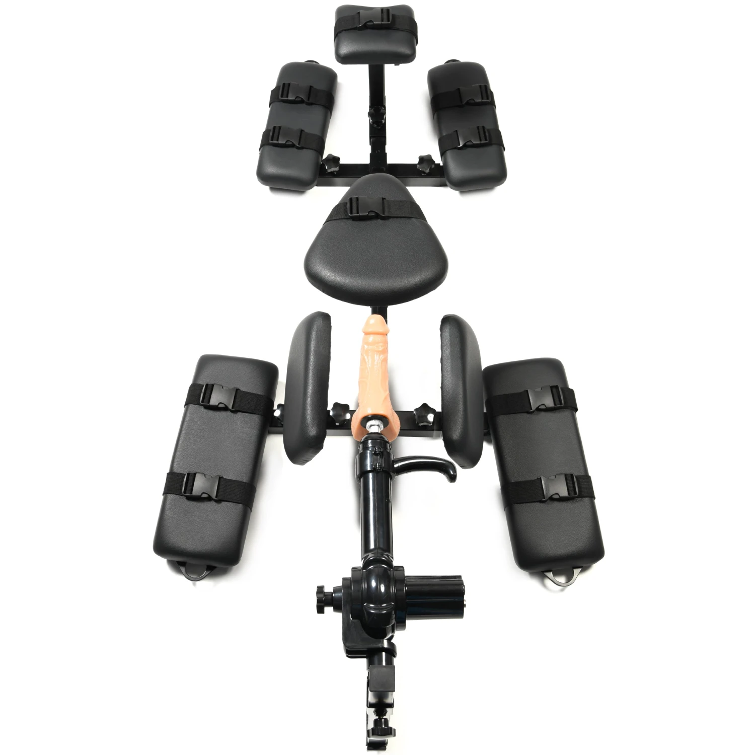 Note: Use dildo only with water-based lubricants. Chin rest, arm pads, torso pad, and sex machine bracket are all adjustable lengthwise along the main rod. Leg pads are attached to the main arm and are not adjustable.