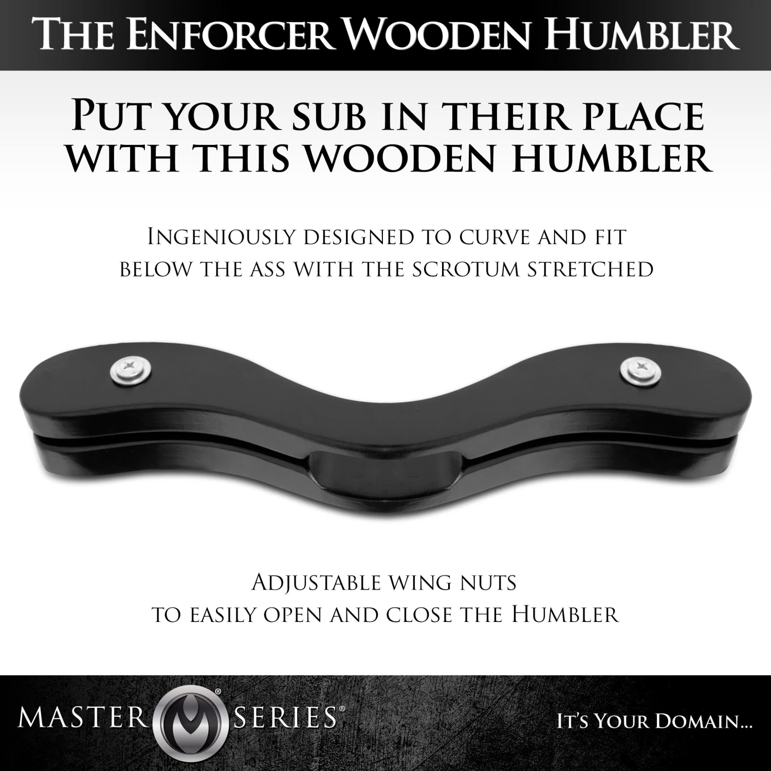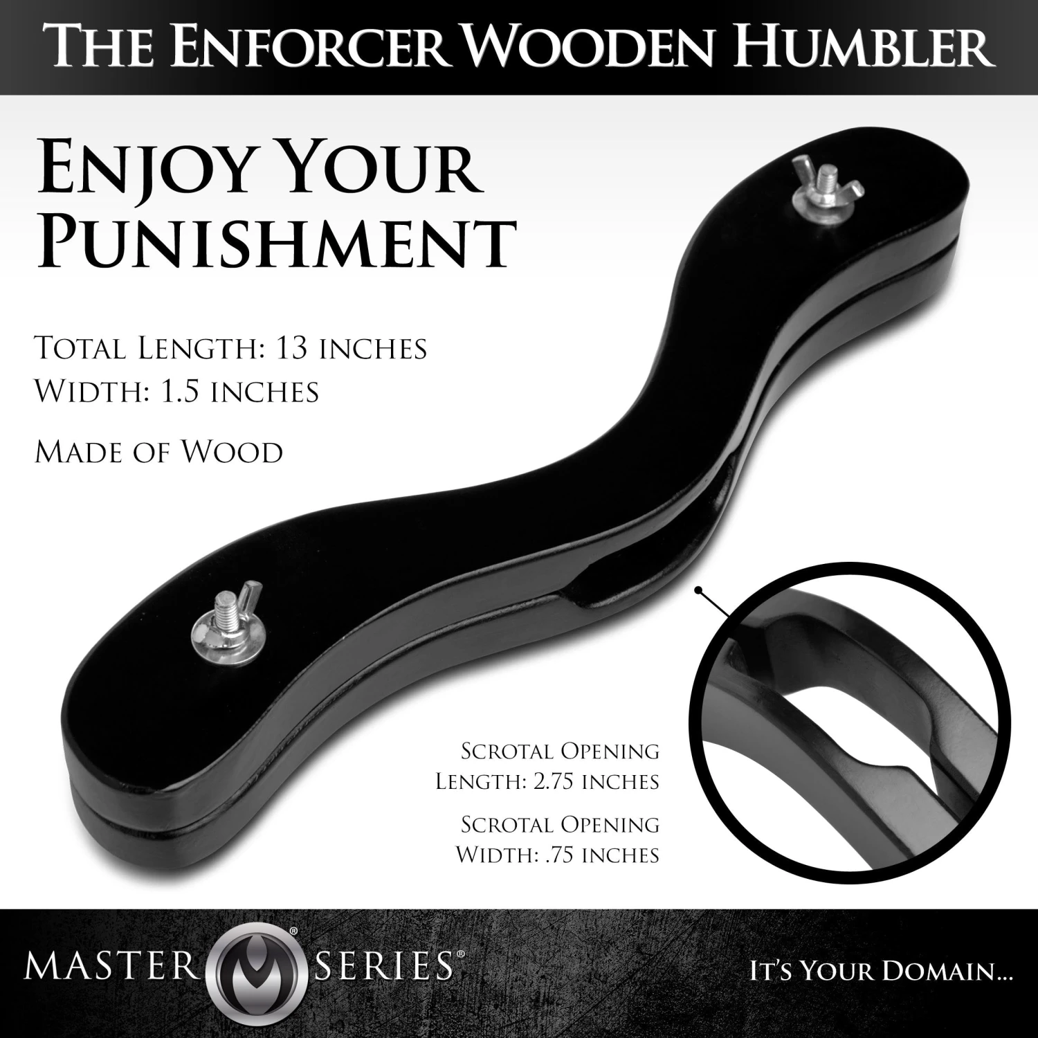 Made out of two black wood pieces with a carved opening for the balls, the two halves get screwed together snugly over the wearers scrotum. Once the humbler is in place he will not be able to straighten out or stand, if he knows what is good for him.