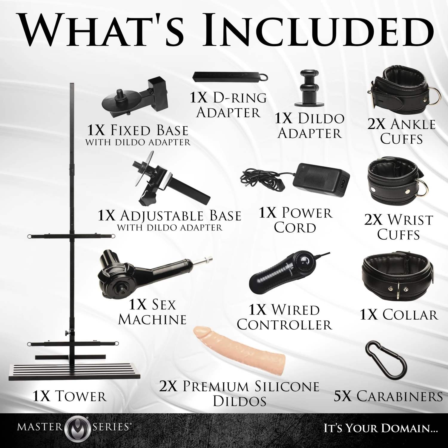 - Dungeon Ready: Includes 1 tower, 1 sex machine, 2 premium silicone dildos, 1 collar, 2 wrist cuffs, 2 ankle cuffs, 5 carabiners, 1 fixed base with dildo adapter, 1 adjustable base with dildo adapter, 1 D-ring adapter.