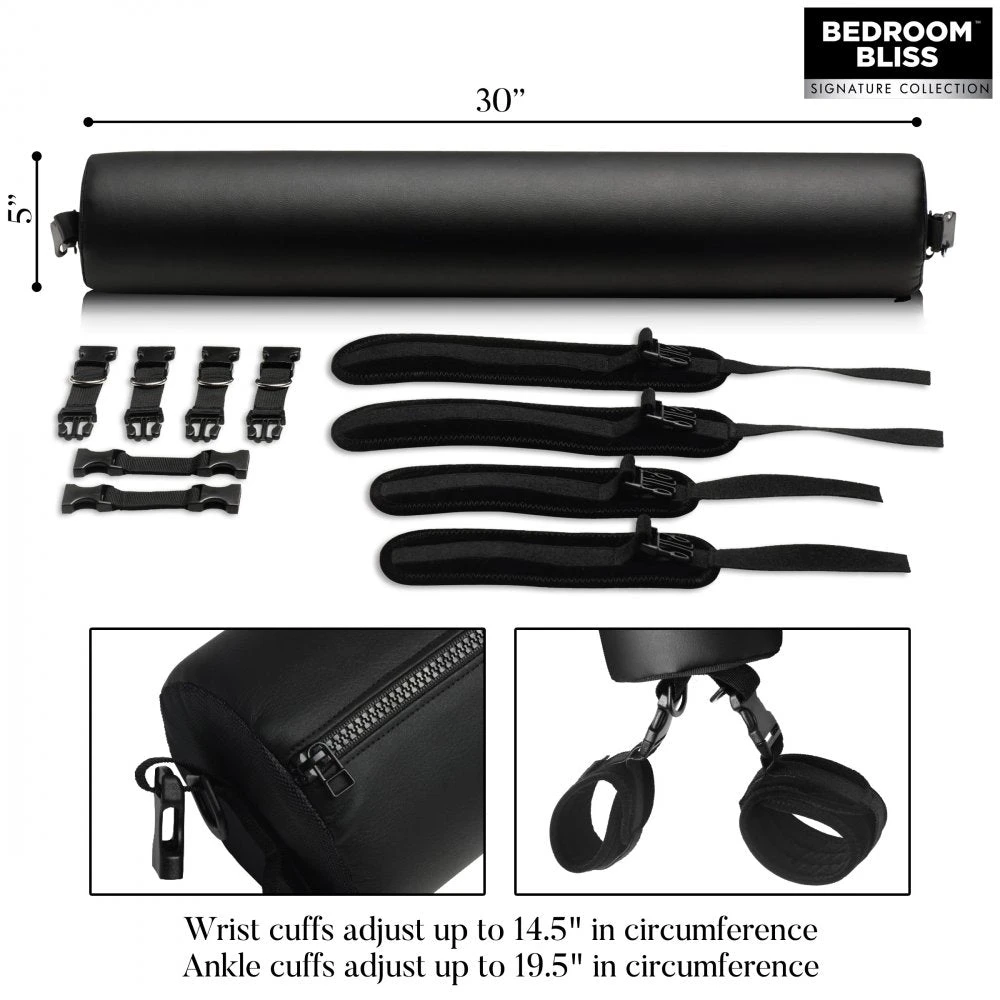 Devise new ways to bind them without harming your submissive by turning the bar into a support aid and propping them up! Use it behind their shoulders to arch the chest, behind the low back to lift the hips, or under the neck to prop up the head if they’re face up and laying down. Place it under their pelvis or hips to more easily access their P-spot when face down. If you want them to kneel, protect their knees and keep them more securely restrained by having them place the padded bar between their thighs and ankles. The weight of their body on the bar will keep them restrained using their own body-weight! Change the way you play and still keep it comfy! Keep their wrists, ankles, or both at once spread for pleasure! Bolster Cushion can be wiped down after your session for easy clean up!