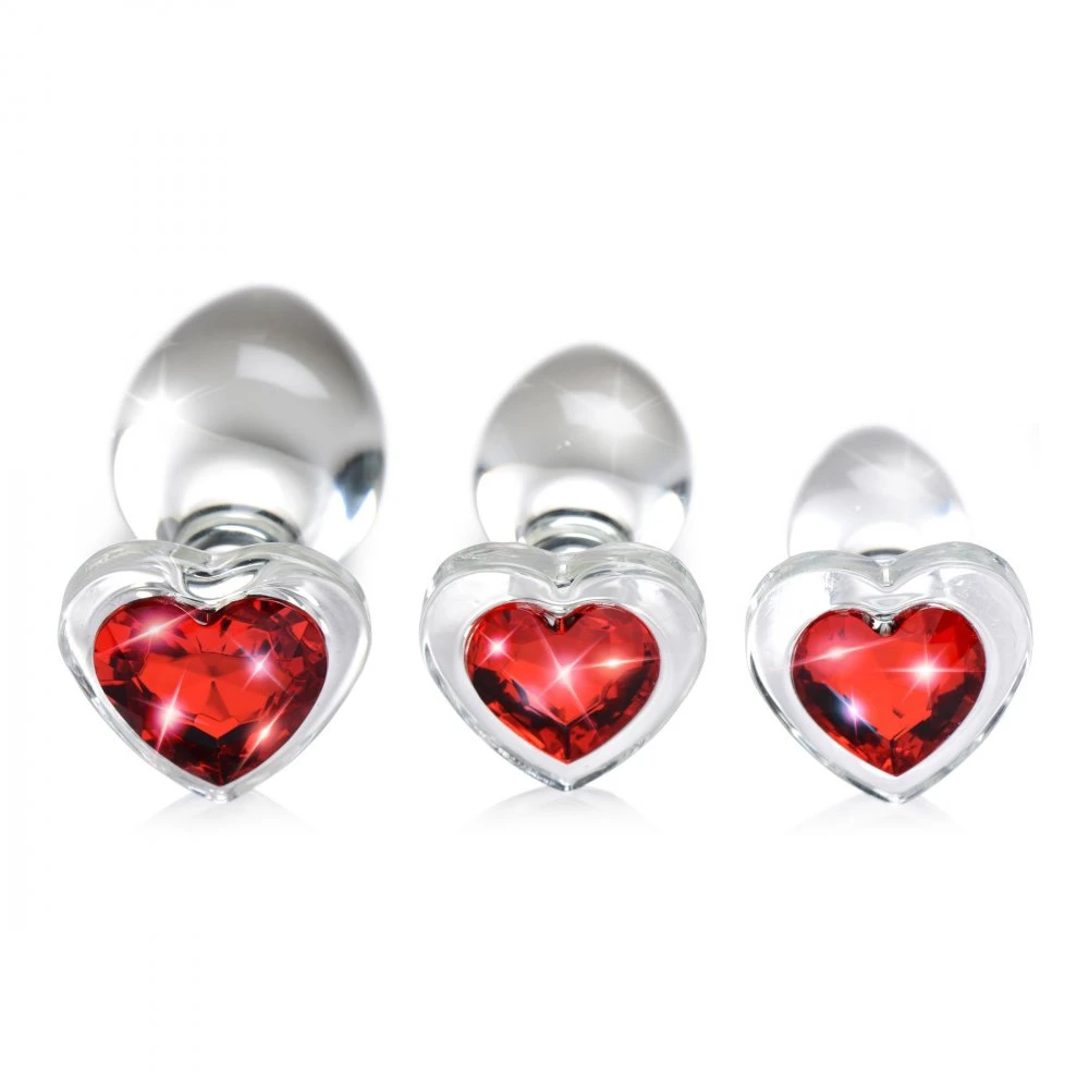 Adorn your booty with a trio of hearts for your lover. The transparent glass is naturally body safe and deliciously solid for a satisyfing, worry free fill. The brilliant red heart gem aesthetically improves your booty while the glass body warms up your hole for further anal play.