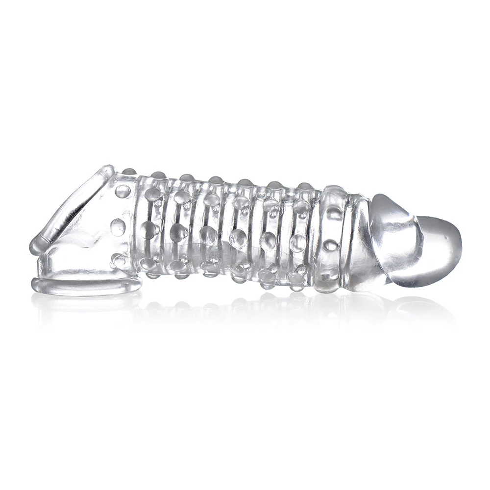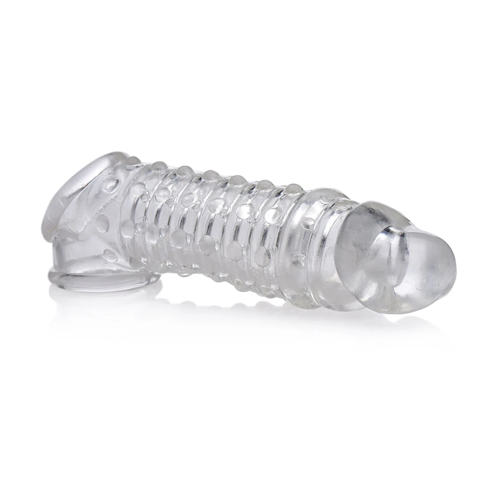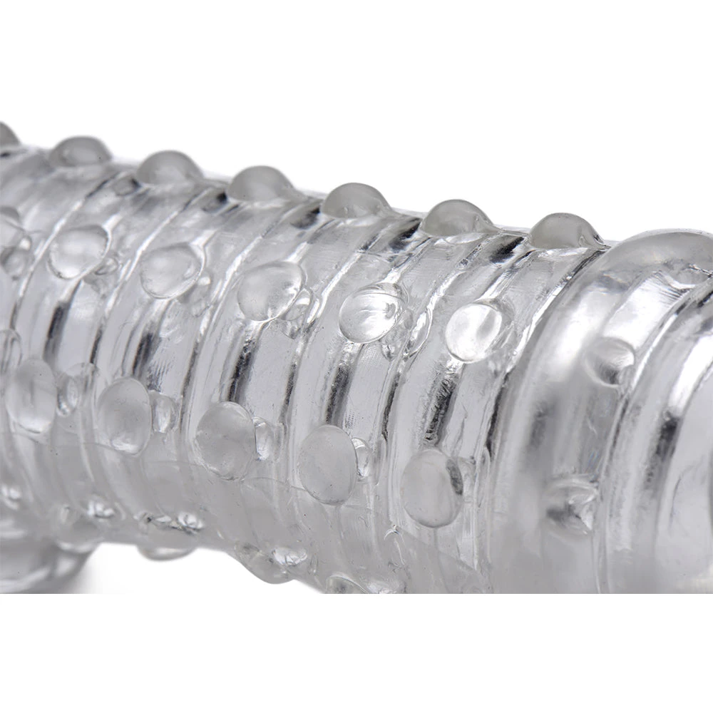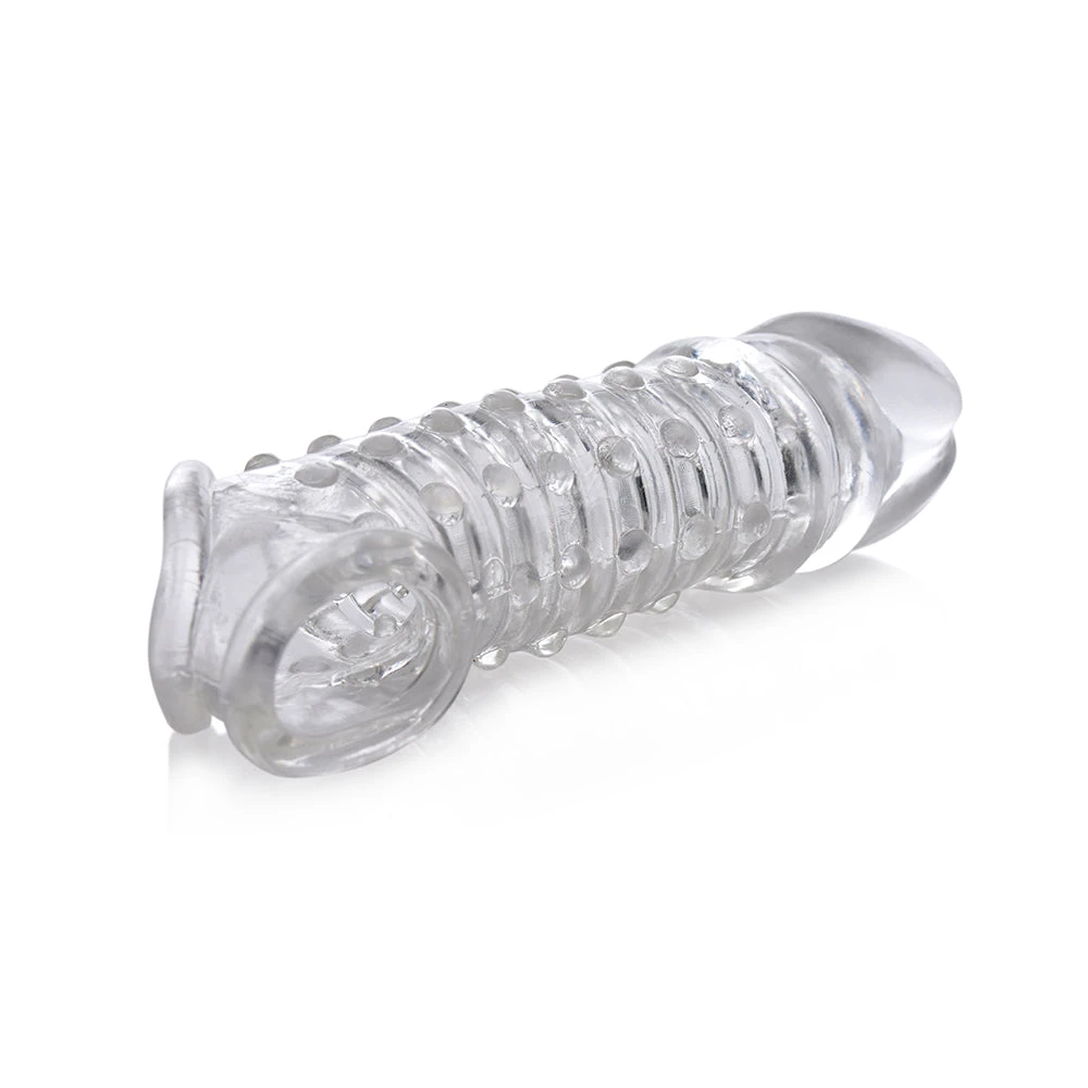 Extend and add girth with this delightful Enhancer Sleeve! The stretchy TPR formula stretches to fit most shaft sizes, adding a solid inch and textured nubs to stimulate your man while you enjoy the internal ribbing on your shaft as you thrust. Perfect for men who want to increase their package size and add extra stimulation to pleasure their partner!