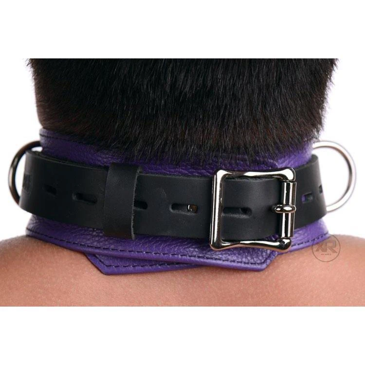 The collar has a distinct black and purple color and 3 D-rings for attachment to a leash or any of the other bondage gear in your collection. The collar is designed for durability, stability and function so feel free to take your bondage play to the limits of your imagination.