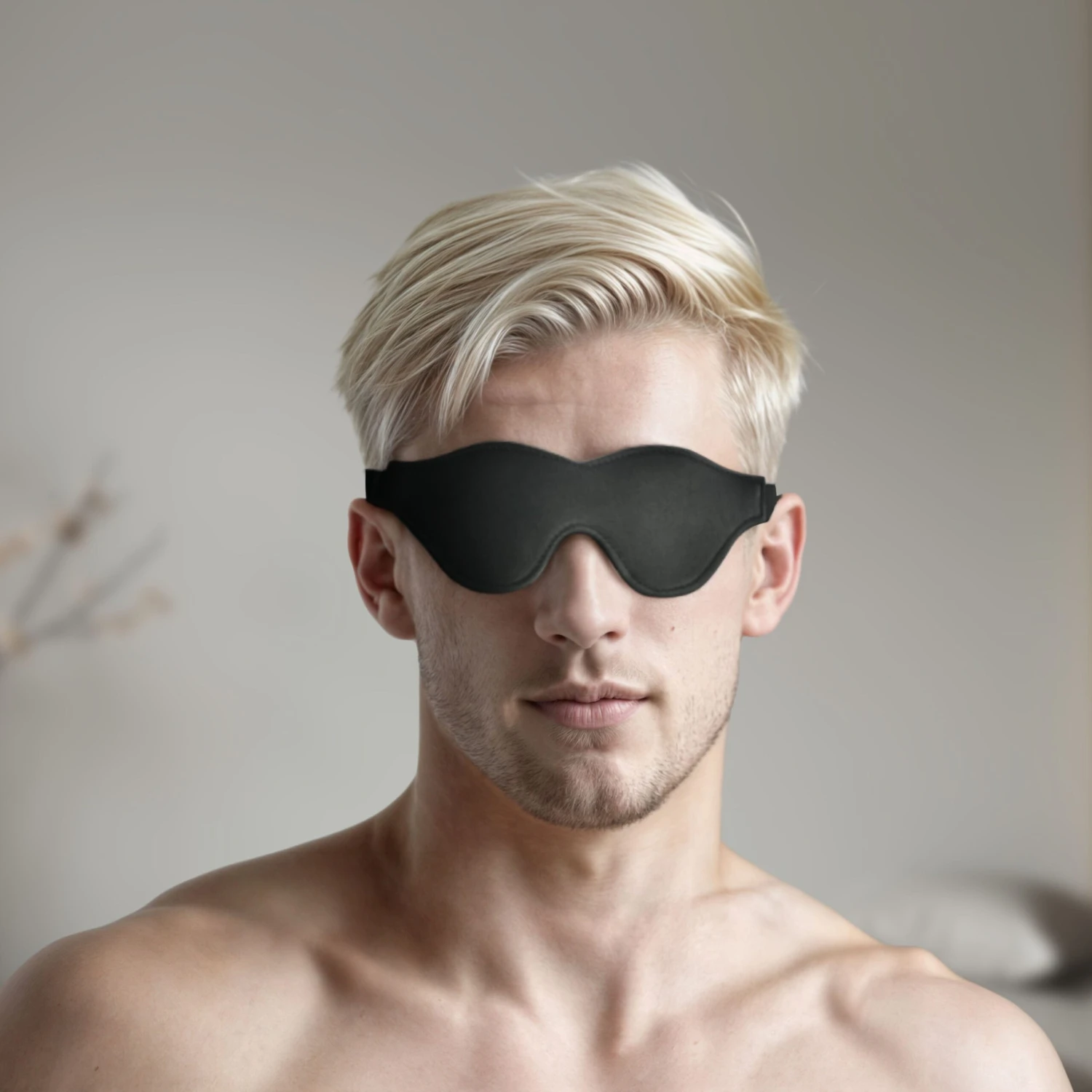 Our fleece lined blindfold is made of high quality black leather and held in place with a comfortable elastic strap.