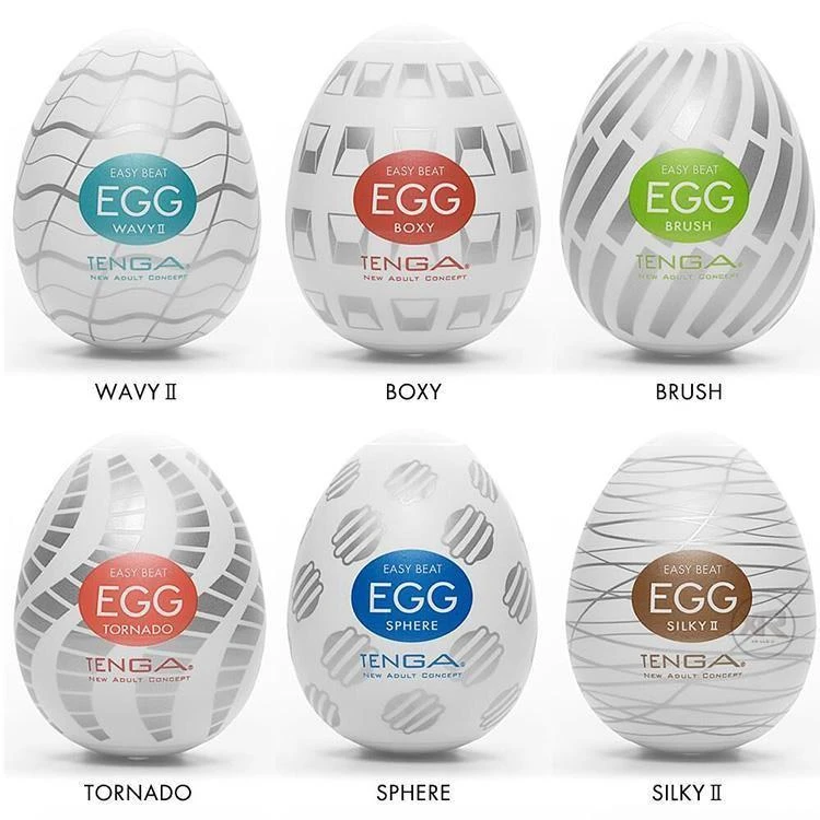 Now made of a thicker, more durable material for longer-lasting fun. Different Strokes from Different Yolks! The TENGA EGG Series may look small, but their super-stretchable material can fit men of all sizes. The external designs of each EGG reflect the internal details within them. With a total of 6 eggs to choose from, you are sure to find a perfect match! This Variety 6 Pack contains 1 each of the following egg styles: Wavy II, Boxy, Brush, Tornado, Sphere, Silky II.